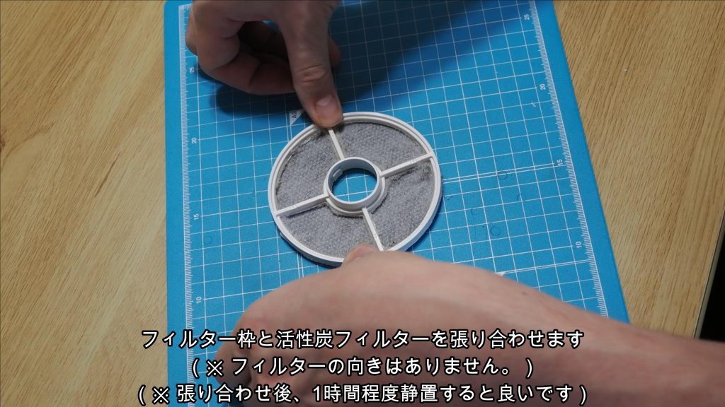 フィルター枠と活性炭フィルターを貼り合わせます。