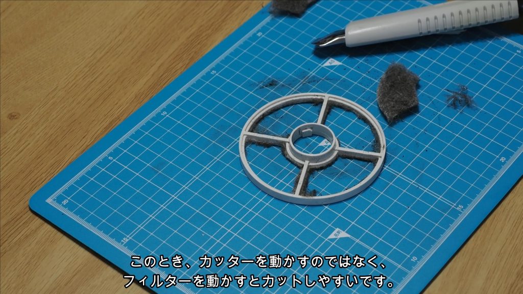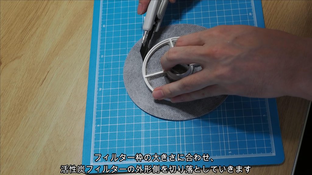 活性炭フィルターにフィルター枠を押し当て、活性炭フィルターの外側をカッターでトリミングします。
