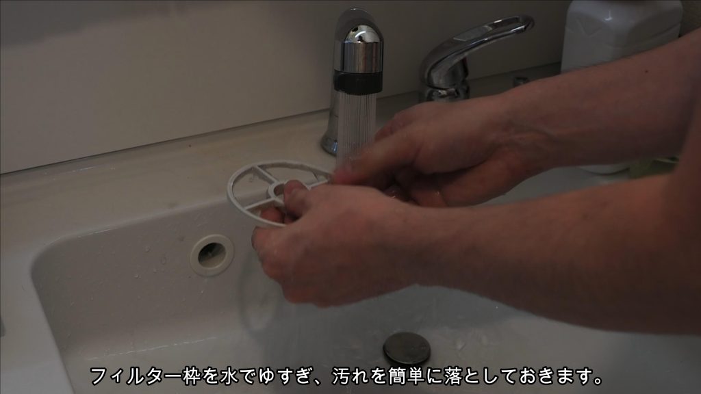フィルター枠を水でゆすぎ、汚れを簡単に落とします。その後、タオルで水気をふき取ります。