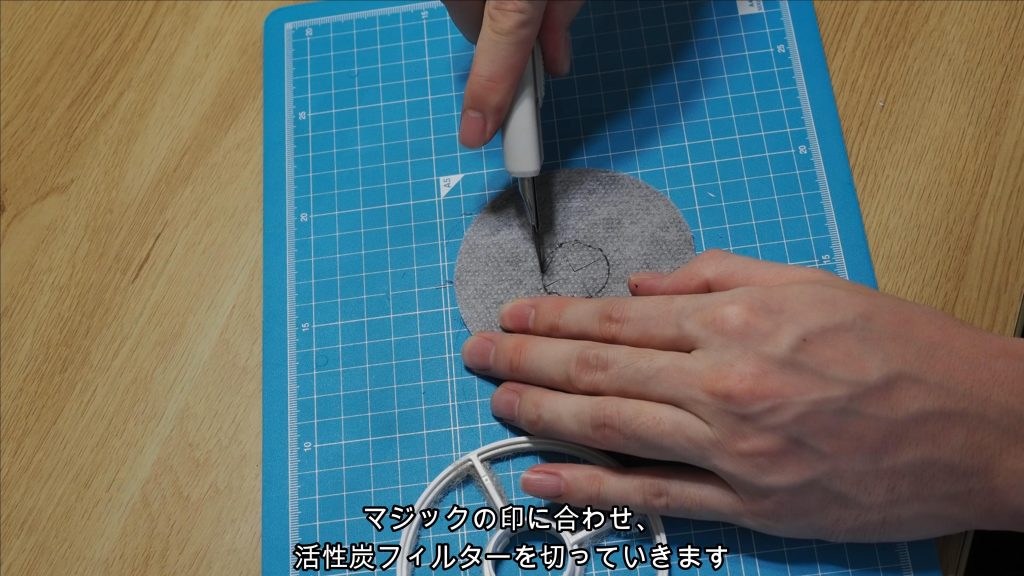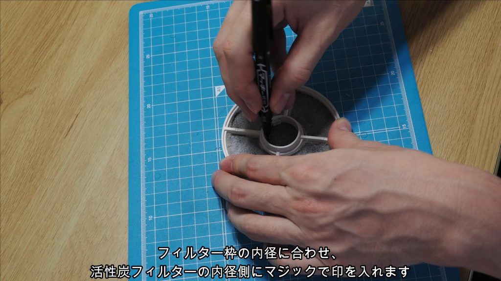 フィルター枠の内径に合わせ、活性炭フィルターにマジックで印を入れます。