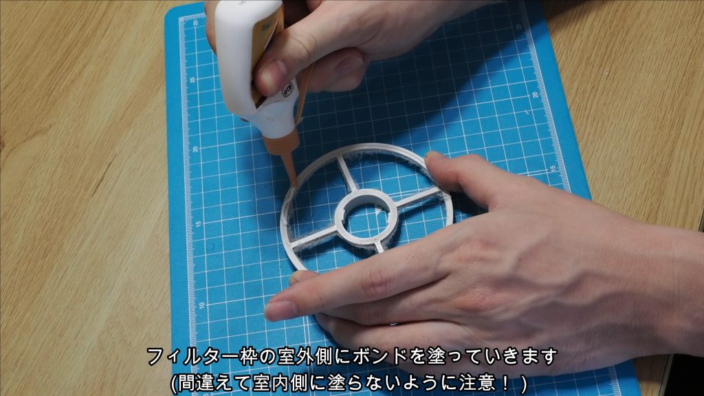 フィルター枠の室外側にボンドを塗ります。(室内側に塗らないように注意)
