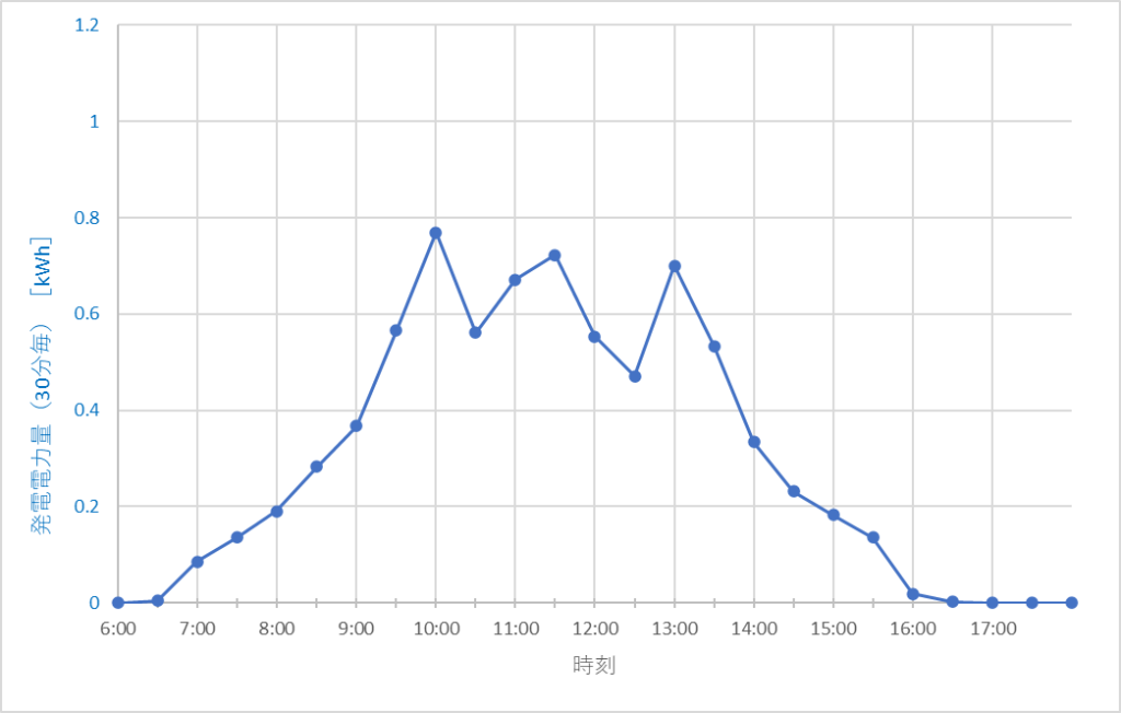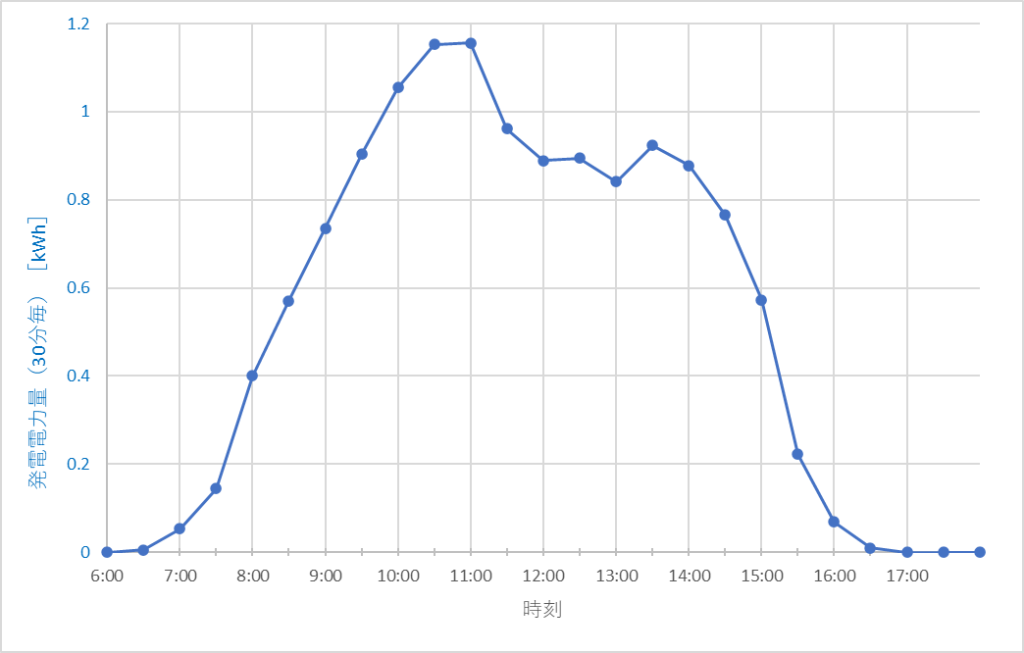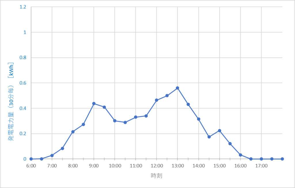 長州産業の遠隔モニタリングサービスに蓄積されたデータから、各日の30分毎の発電電力量(kWh)を抽出しました。
