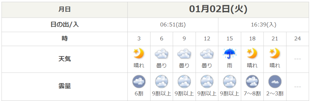 測定日は2024年1月2日、日中は一日中曇り、15時台に一時雨の日です。