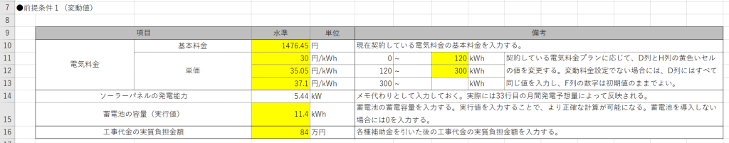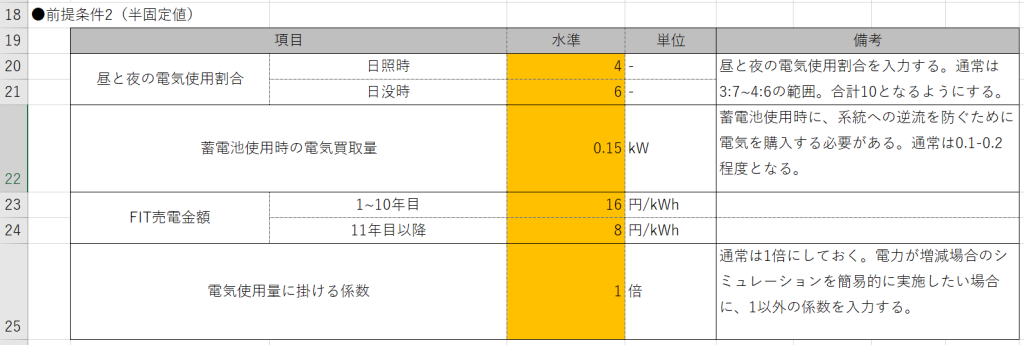 上記のexcelファイルをexcelで開き、前提条件1の表の黄色セルの箇所に数値を入力します。