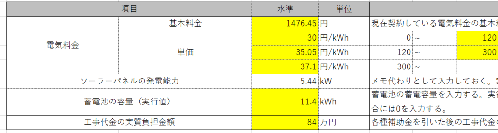 パターン1では、夫婦二人で生活している我が家の状況をシミュレーションしてみます。電気料金には、我が家が契約しているeneos電気の値を記載します。蓄電池の実行容量は11.4kWh、工事代金は84万円でした。