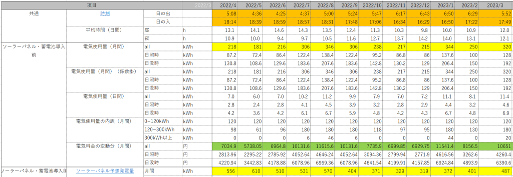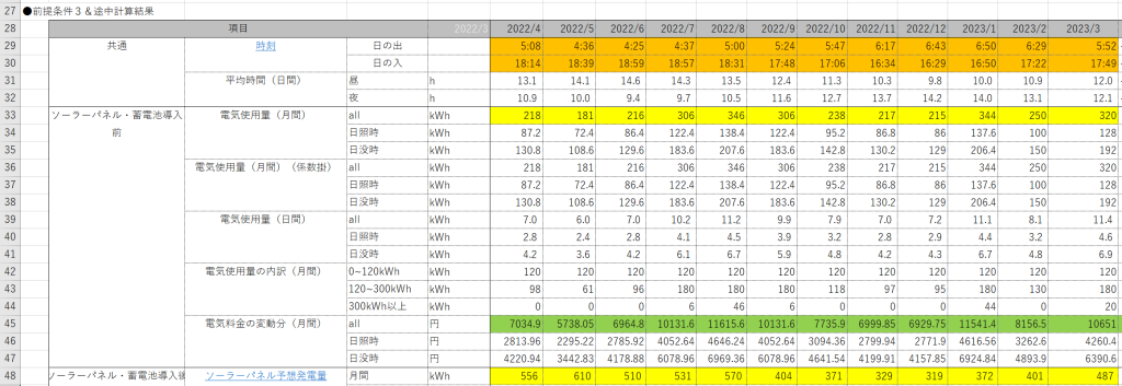 共通・時刻・日の出&日の入のセルには、各月の中日の日の出と日の入りの時刻を入力します。これは、前述した夜間の蓄電池使用時の買電計算に使用されます。初期値では東京の数値が入っています。他の地域において初期値を使用してもそれほど計算結果への影響はありません。よってこの数値は初期値のままでも構いません。