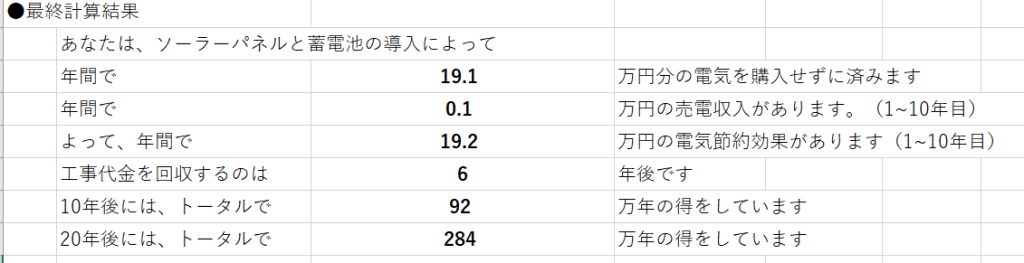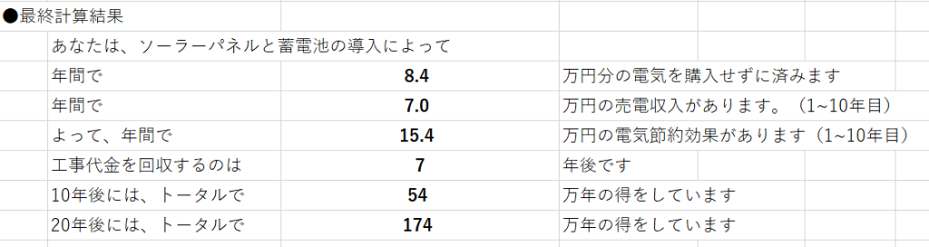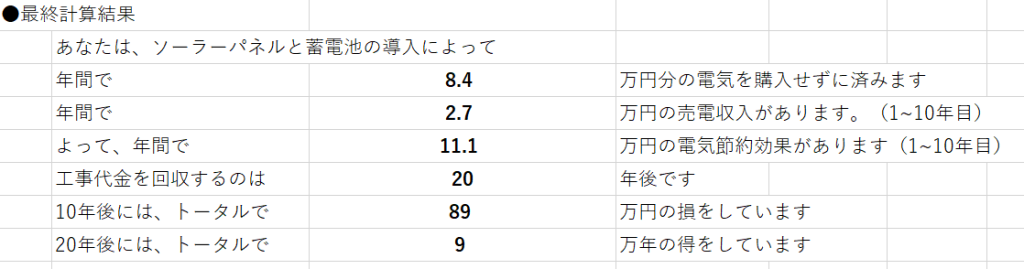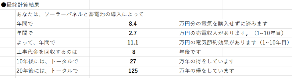その結果、下記のように計算されました。8年で工事代金を回収し、20年後には125万円の特をしているという計算結果です。