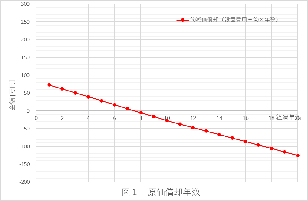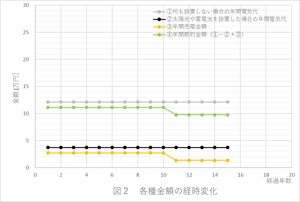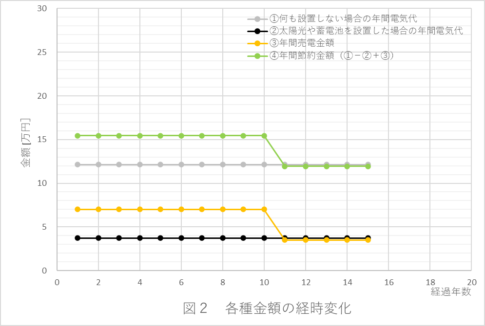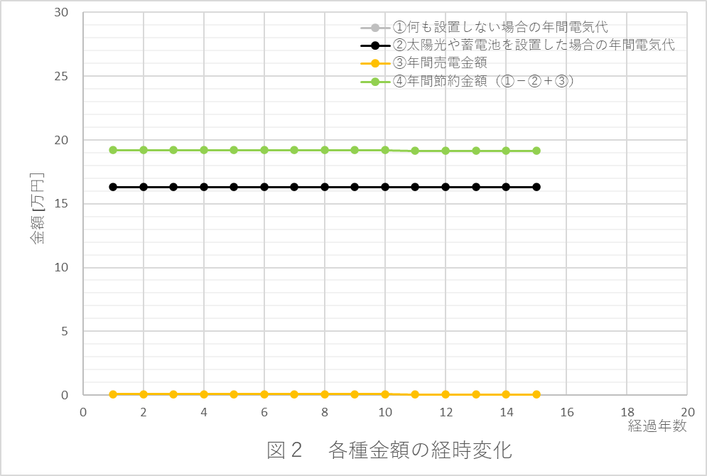 パターン1では8年で工事代金を回収できていたのが、今回は20年になってしまいました。20年も経ってしまうと蓄電池が寿命を迎えてくるため、実質的に投資を回収するのは難しいかもしれません。